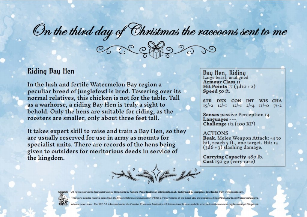D12 Days of Christmas, day 3 Hello, dear readers! Third day of Christmas is upon us! The raccoons really outdid themselves and brought three of these rare mounts. Lock your granaries! Share this: Click to share on X (Opens in new window) X Click to share on Facebook (Opens in new window) Facebook Related