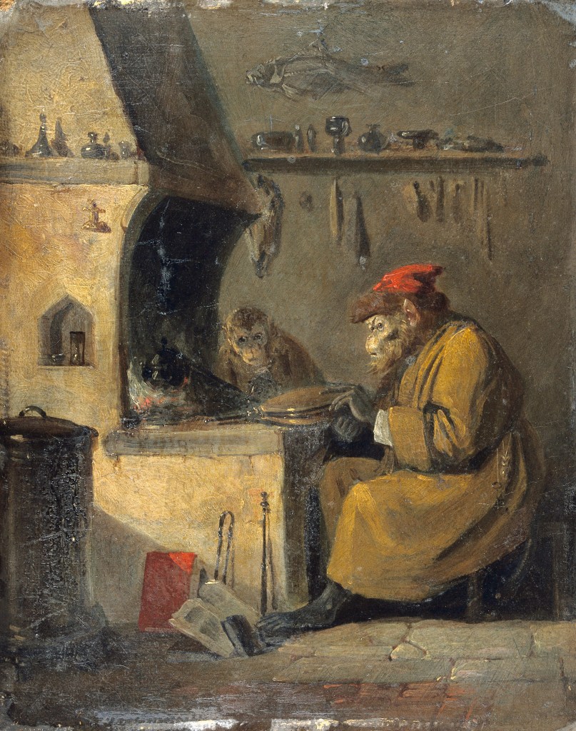 A monkeyman alchemist heating the mold he’s making his new polymer in! Oil by Edmund Bristow (1787–1876) via lookandlearn.com (CC BY 4.0)